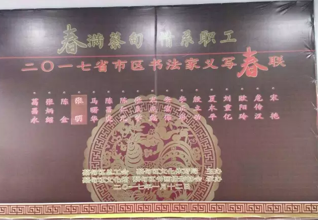 元月12日上午,在雞年新春即將來(lái)臨之際,蔡甸區(qū)總工會(huì)組織省市區(qū)書(shū)法協(xié)會(huì)書(shū)法家在區(qū)總工會(huì)工人活動(dòng)中心開(kāi)展《春滿(mǎn)蔡甸·情系職工》2017省市區(qū)書(shū)法家義寫(xiě)春聯(lián)、送祝?;顒?dòng)。區(qū)總工會(huì)、文體局相關(guān)領(lǐng)導(dǎo)、省市區(qū)著名書(shū)法家張良學(xué)、陳昌虎、宋成彪等出席了此次活動(dòng),集團(tuán)公司人事行政部吳志勇、周仟應(yīng)邀參加了該活動(dòng)。