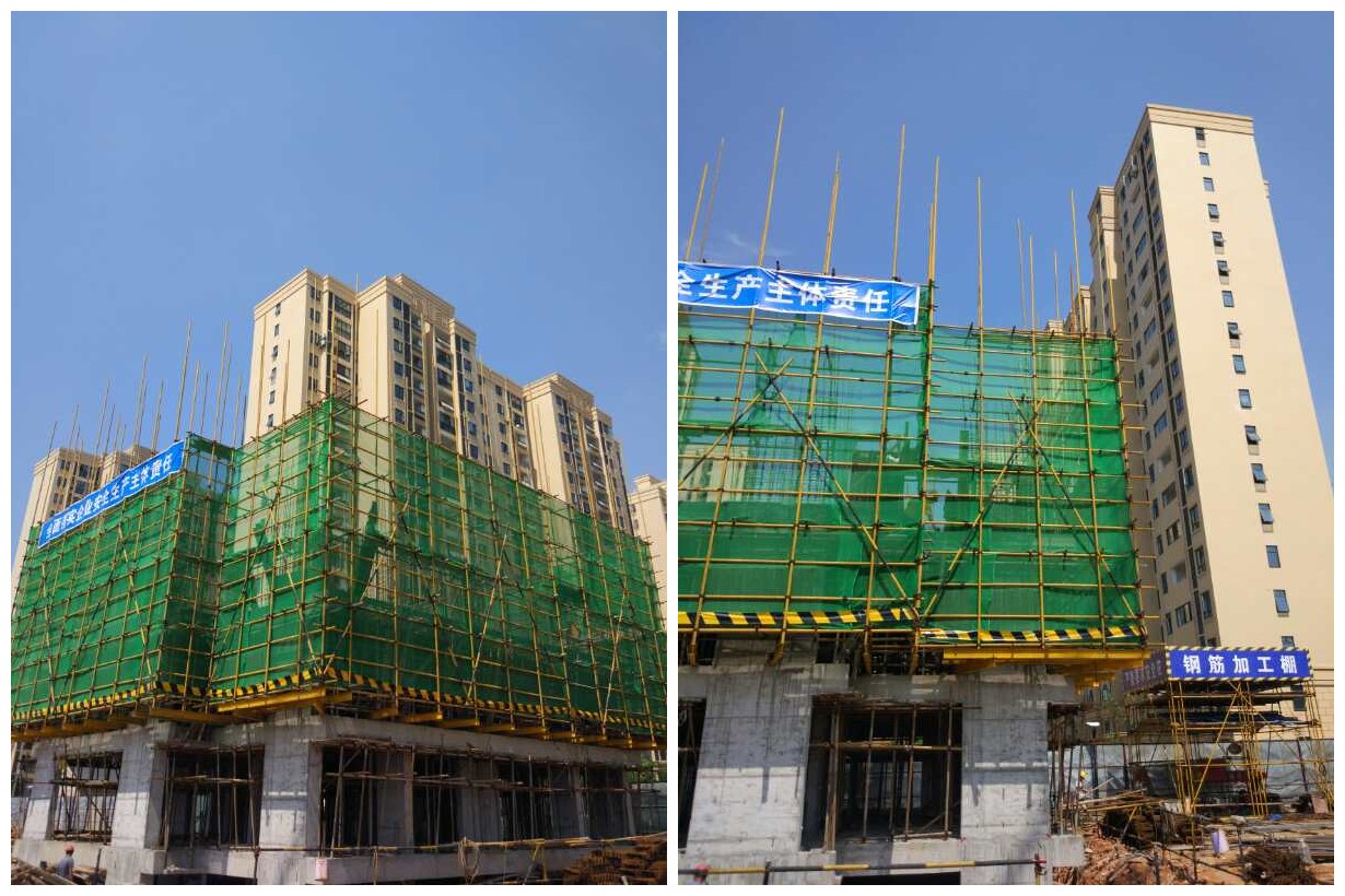 (6月7日,工程管理部檢查結(jié)果:外架采用最新規(guī)范要求,每步架子設(shè)置兩道攔腰桿,間距600,防護功能更好。)