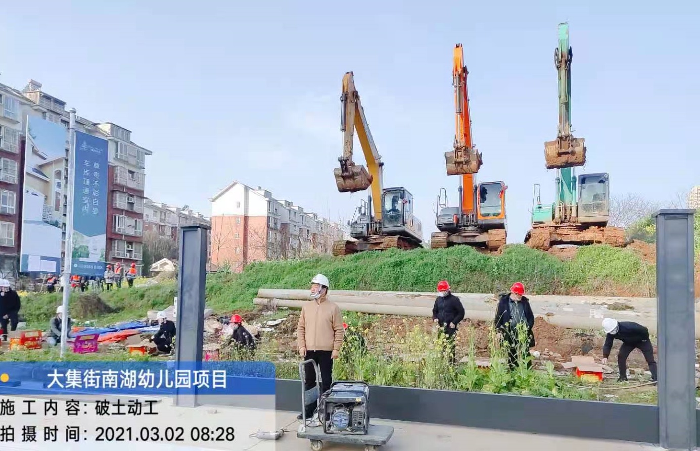 3月2日上午,伴隨著震耳欲聾的鞭炮聲,集團副總經理徐家富宣布破土動工,三輛挖機同時開槽破土,由集團公司承建的南湖幼兒園項目工程正式開工建設!