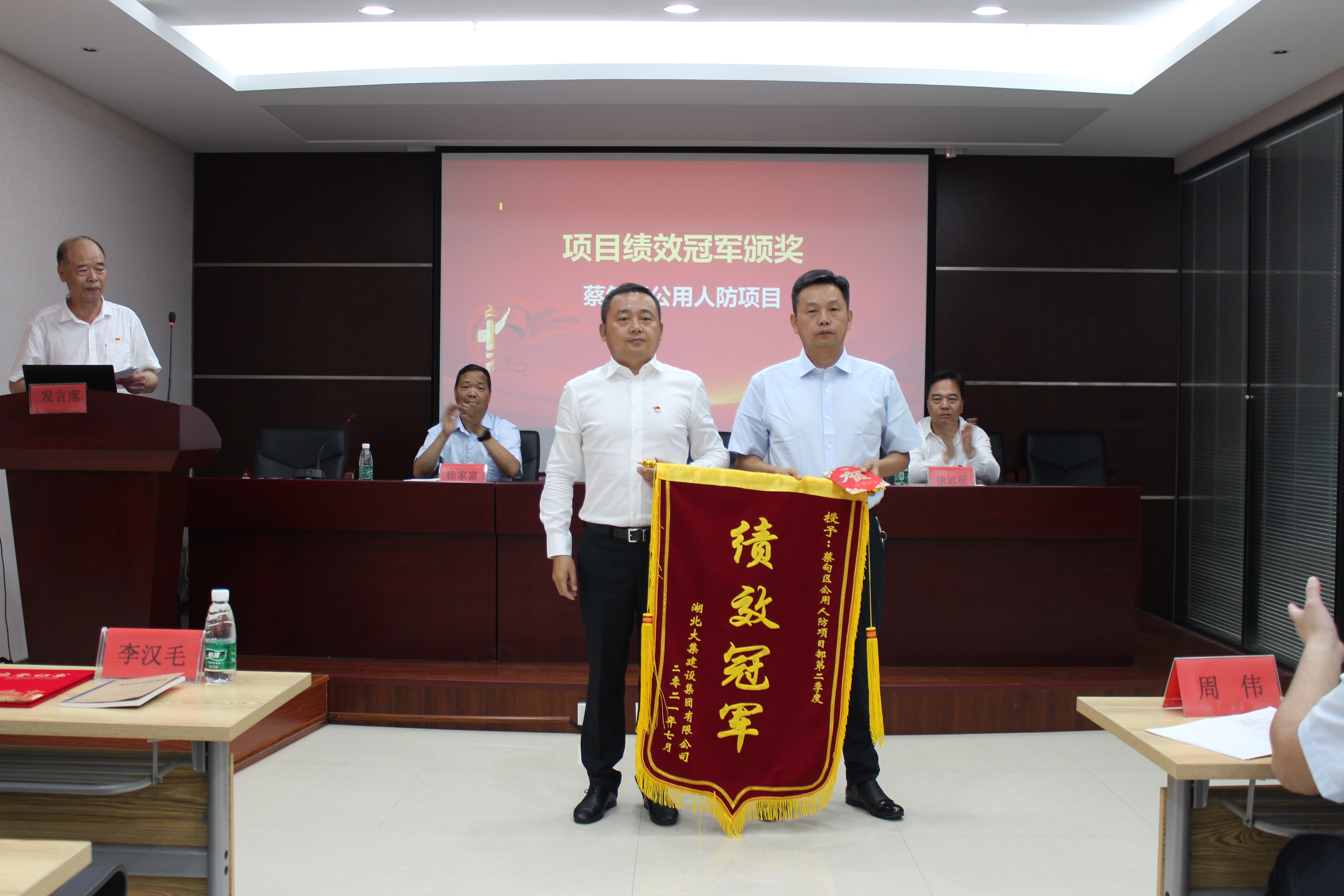 集團(tuán)董事長徐濤為此次績效考評中的冠軍項(xiàng)目——蔡甸區(qū)公用人防項(xiàng)目部頒發(fā)錦旗和獎金。