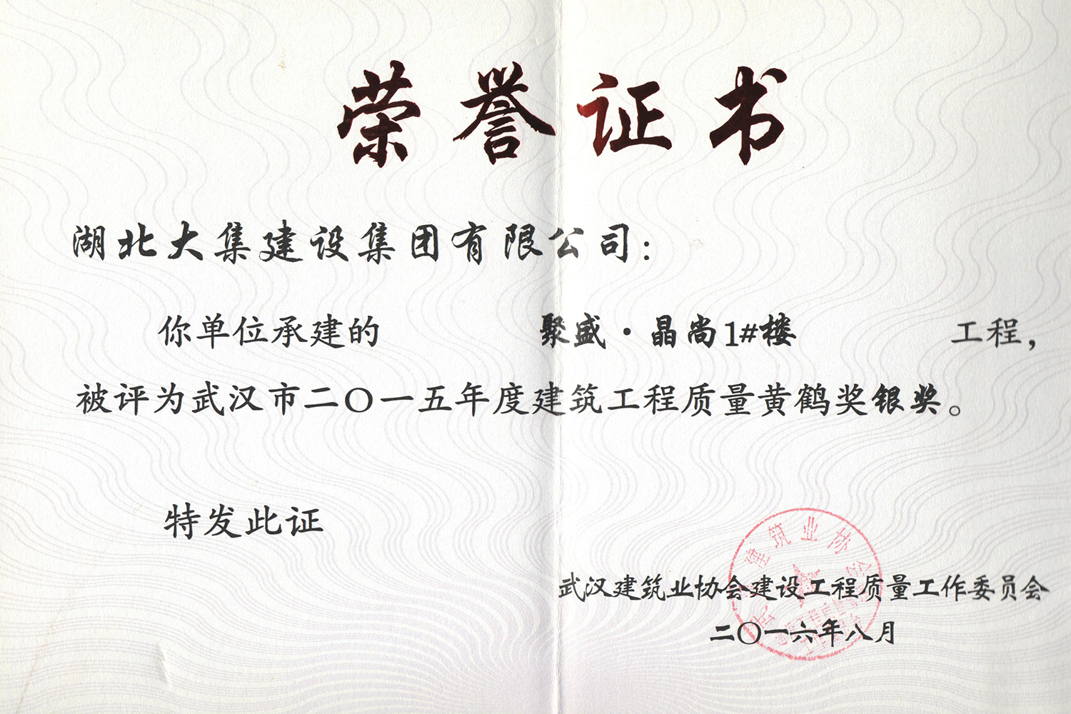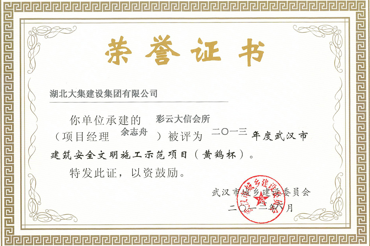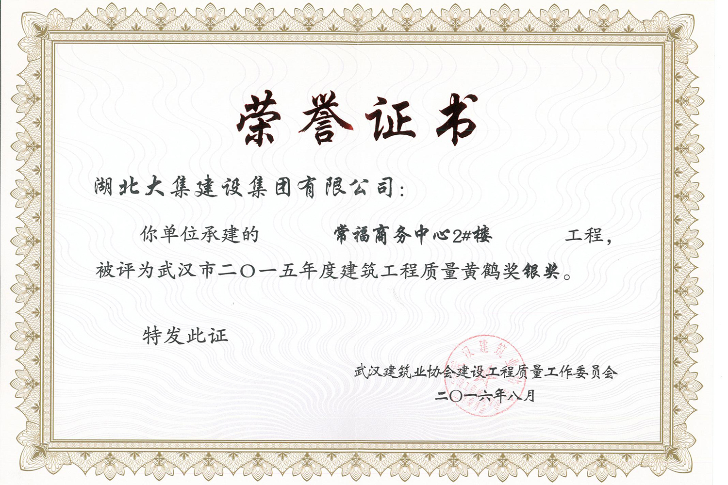 集團在發(fā)展壯大的同時,堅持守法經(jīng)營、依法納稅,堅持履行社會責任,多年來積極投身社會公益事業(yè)。省、市、區(qū)行業(yè)主管部門連續(xù)多年授予公司為“武漢地區(qū)建筑業(yè)AAA信譽企業(yè)”、“武漢地區(qū)建筑業(yè)優(yōu)秀企業(yè)”、“武漢市最具成長性民營建筑企業(yè)”、“勞動保障守法誠信A級單位”等榮譽,多次被省、市工商局評為“守合同重信用”企業(yè),多年被地方政府授予“納稅貢獻獎”。