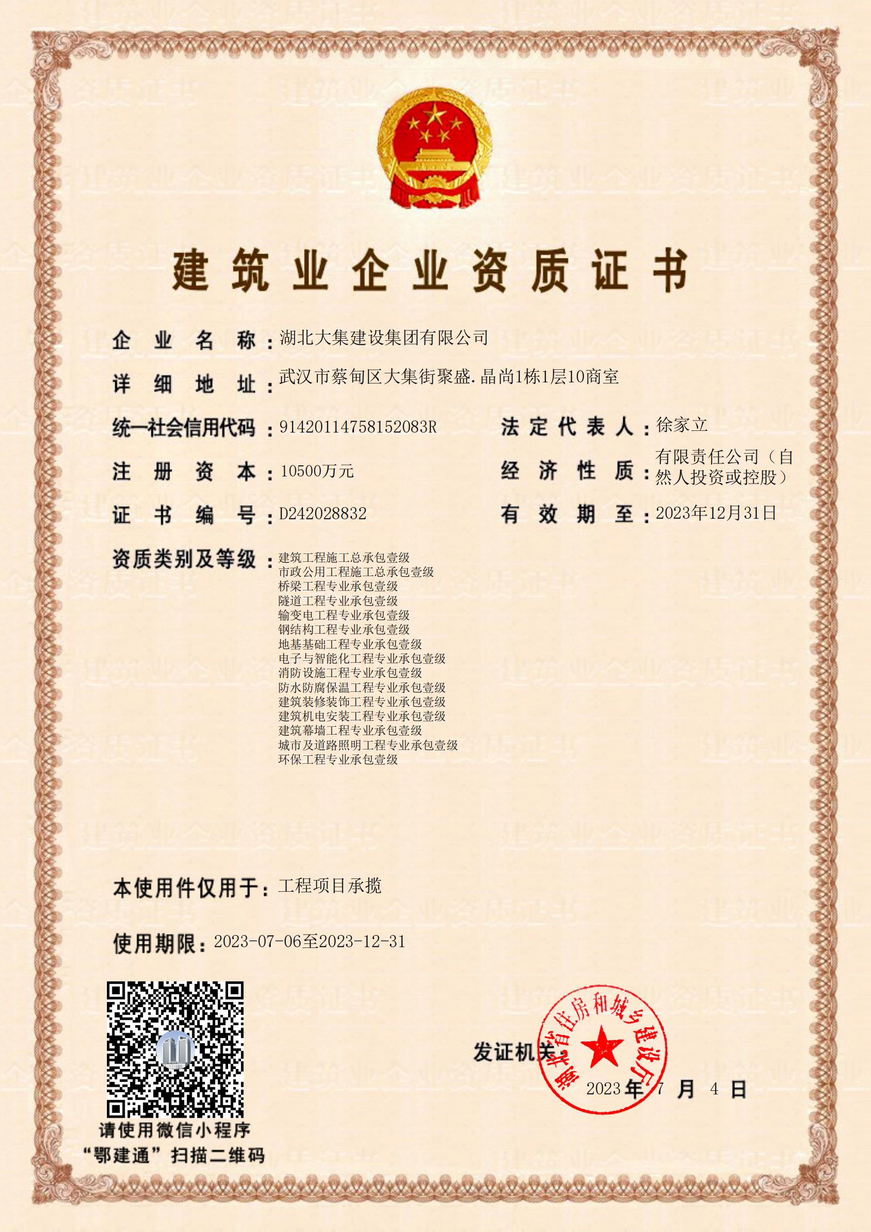 湖北大集建設(shè)集團有限公司成立于1990年,注冊資本10500萬元,是武漢市蔡甸區(qū)本土建筑行業(yè)的龍頭企業(yè),在行業(yè)內(nèi)具有一定的品牌影響力。擁有建筑工程施工總承包一級、市政公用工程施工總承包一級、橋梁工程專業(yè)承包一級、隧道工程專業(yè)承包一級、輸變電工程專業(yè)承包一級、鋼結(jié)構(gòu)工程專業(yè)承包一級、地基基礎(chǔ)工程專業(yè)承包一級、電子與智能化工程專業(yè)承包一級、建筑裝修裝飾工程專業(yè)承包一級等多項資質(zhì)?,F(xiàn)已形成“建筑施工、園林綠化、文化旅游、房地產(chǎn)開發(fā)與物業(yè)管理”四大產(chǎn)業(yè)格局,并通過了行業(yè)和國家質(zhì)量管理體系、環(huán)境管理體系和職業(yè)健康安全管理體系認證,三大安全管理體系日臻完善,是一家綜合力較強的綜合性建筑施工企業(yè)。