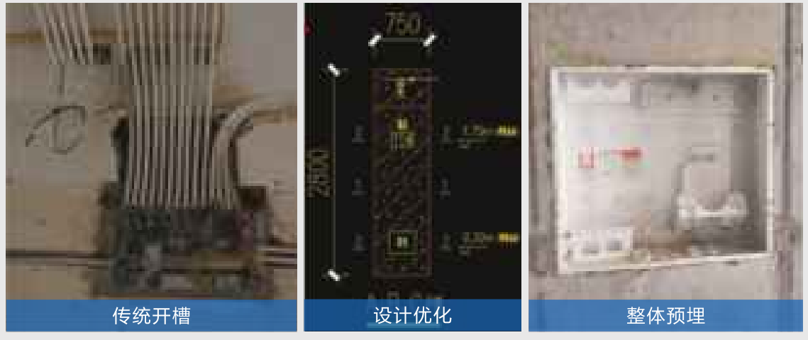 強(qiáng)弱電箱原圖紙?jiān)谄鲶w上開(kāi)槽后埋線(xiàn)盒子,再進(jìn)行用砂漿修補(bǔ),這樣在工人施工過(guò)程中容易鑿斷或者震裂砌墻,后期修補(bǔ)因砂漿過(guò)厚也會(huì)引起面層開(kāi)裂。為確保質(zhì)量,經(jīng)過(guò)設(shè)計(jì)優(yōu)化,增加構(gòu)造柱預(yù)埋線(xiàn)管及電箱,這樣不但解決開(kāi)裂問(wèn)題,加快了施工進(jìn)度,大大消除了質(zhì)量風(fēng)險(xiǎn)。