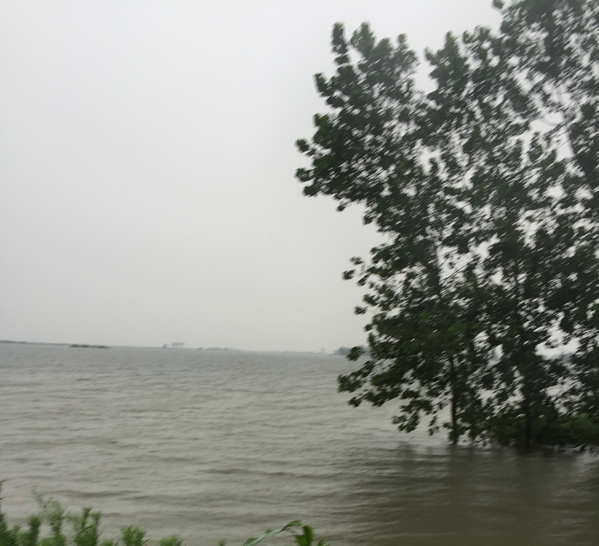 車子行駛在大堤上,隨處可見紅旗招展,黨旗迎風飄揚,隔段就有帳篷拉起來的簡陋住所。這里的田疇已經完全泡在水里,稻谷和高梁果樹已浸泡得不成樣子。大堤上雖然不知道有多少人筑守在這里,一路行駛中到處可以看到分村分段守護的標牌矗立著。