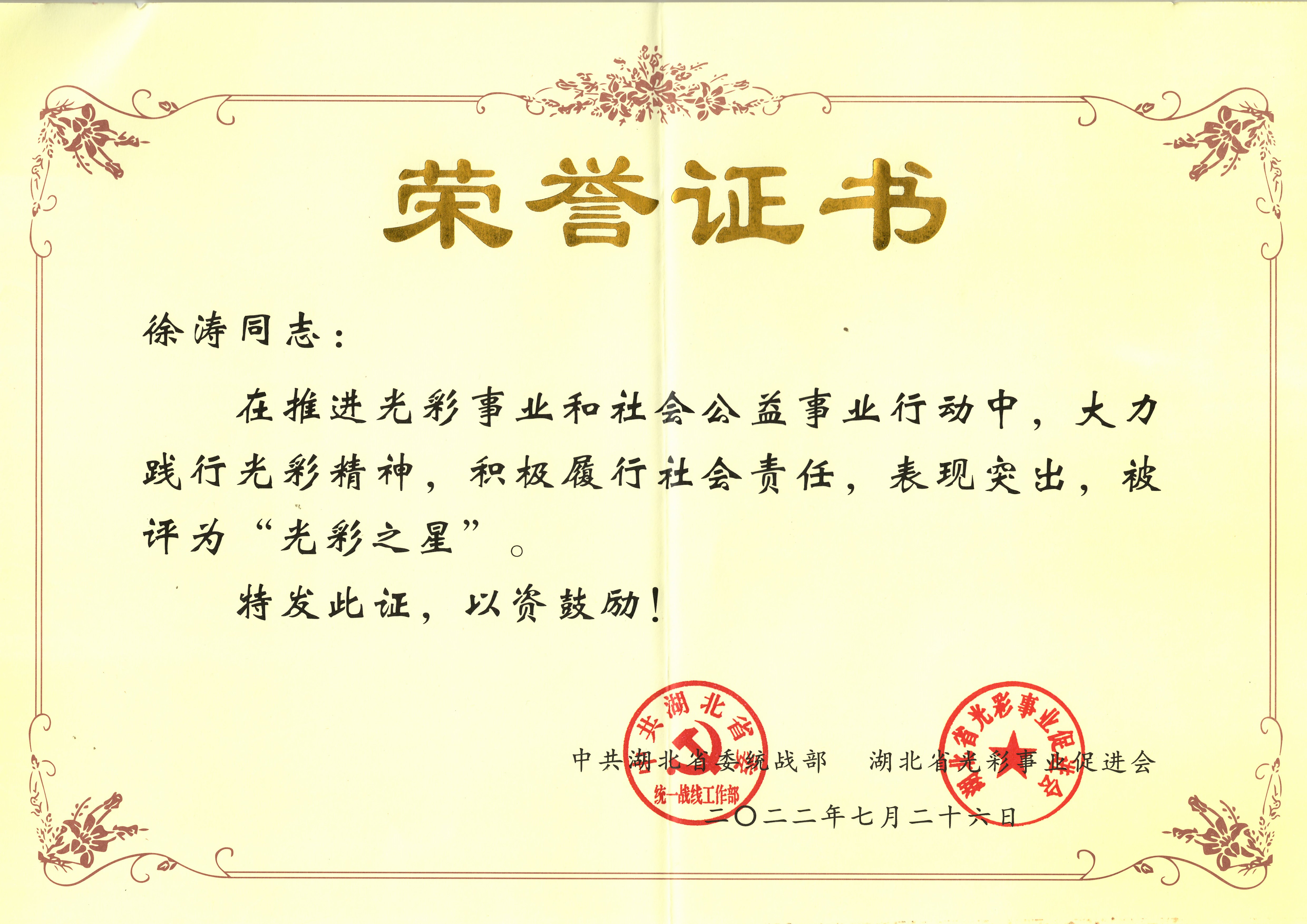 近日,由中共湖北省委統(tǒng)戰(zhàn)部、省光彩事業(yè)促進(jìn)會共同評選60名民營經(jīng)濟(jì)人士“光彩之星”表彰會在恩施召開。會議表彰了一批熱心公益事業(yè)、積極回報社會的優(yōu)秀非公有制經(jīng)濟(jì)人士,湖北大集建設(shè)集團(tuán)有限公司董事長、武漢閱景匯投資發(fā)展有限公司董事長徐濤榮獲全省“光彩之星”榮譽(yù)稱號!